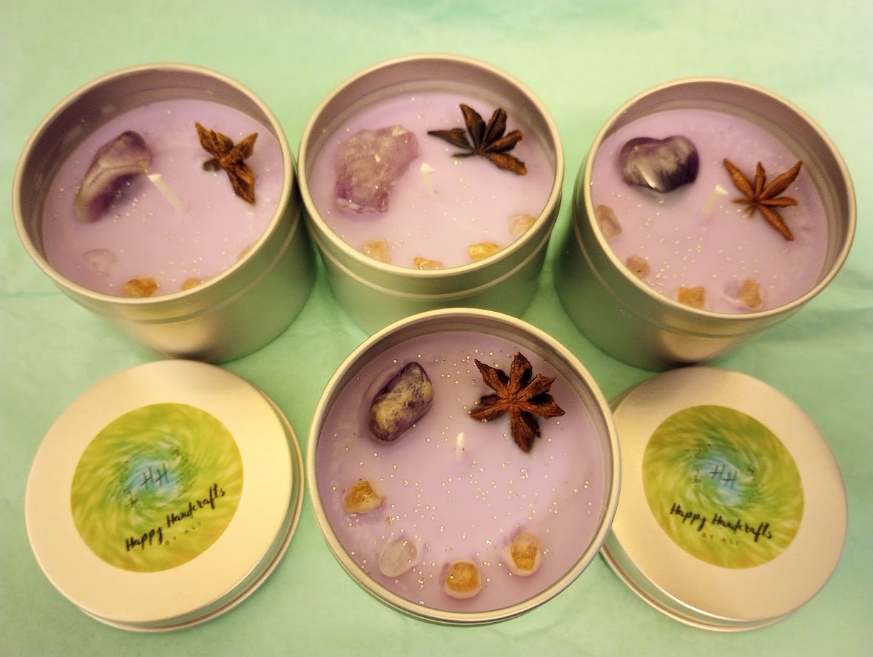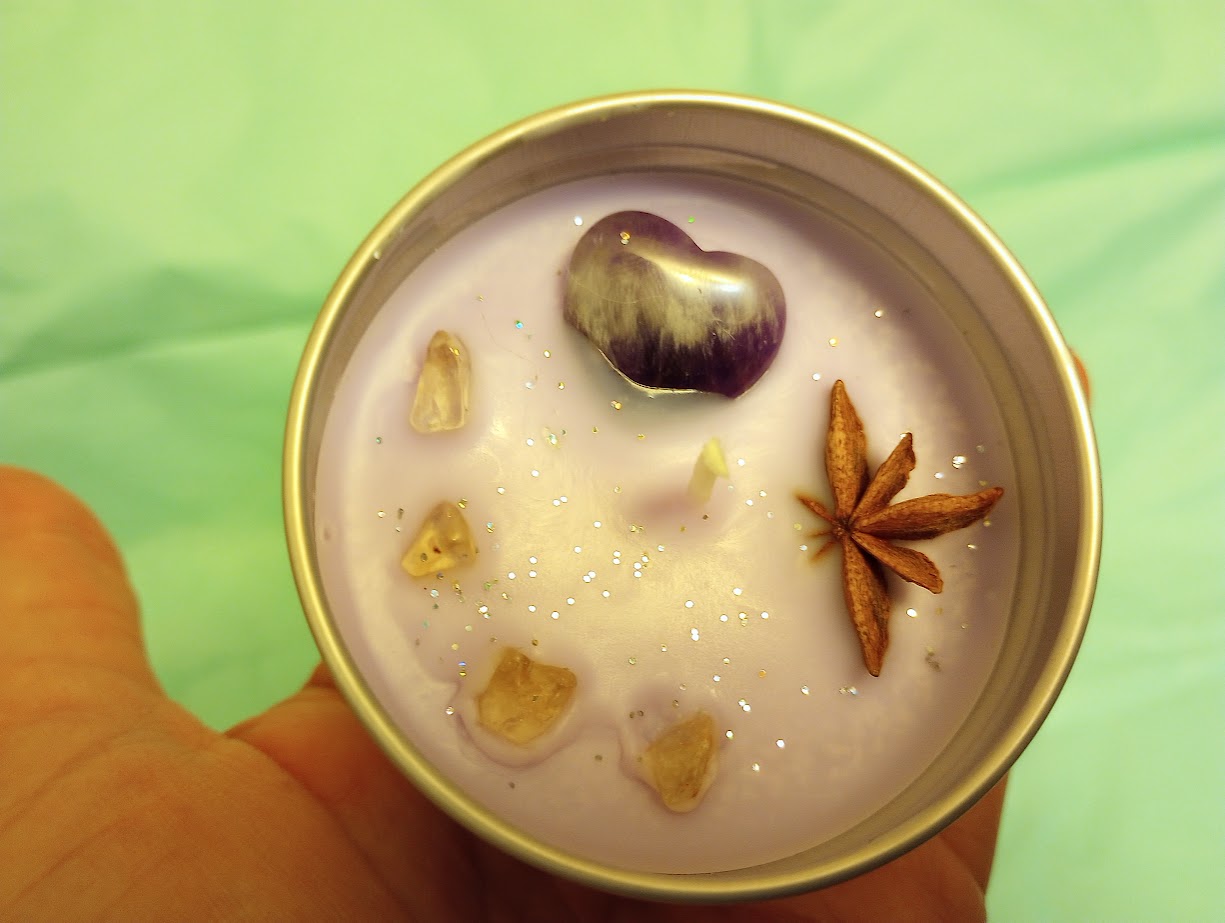 Hand poured organic soy wax candle fragranced with lavender, pine, and clove essential oils. Topped with Amethyst and Citrine crystal, star anise, and biodegradable glitter.