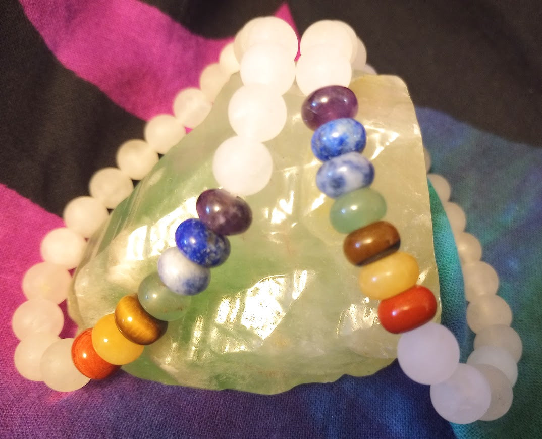 Chakra Alignment crystal bracelet is made with crystal beads from Tejas Beads. The colors on this bracelet represent the colors of our 7 chakras. Authentic healing crystals include Red Jasper, Yellow Jade, Tiger's Eye, Fluorite, Sodalite, Lapis Lazuli, Amethyst, and White Jade.