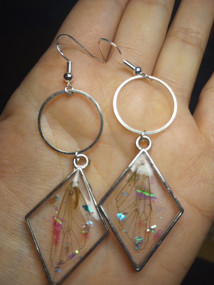 Real cicada wings encased in UV resin and framed with a high quality alloy metal frame. No rust. No color fading. No skin irritation. Hypoallergenic sterling silver hooks.