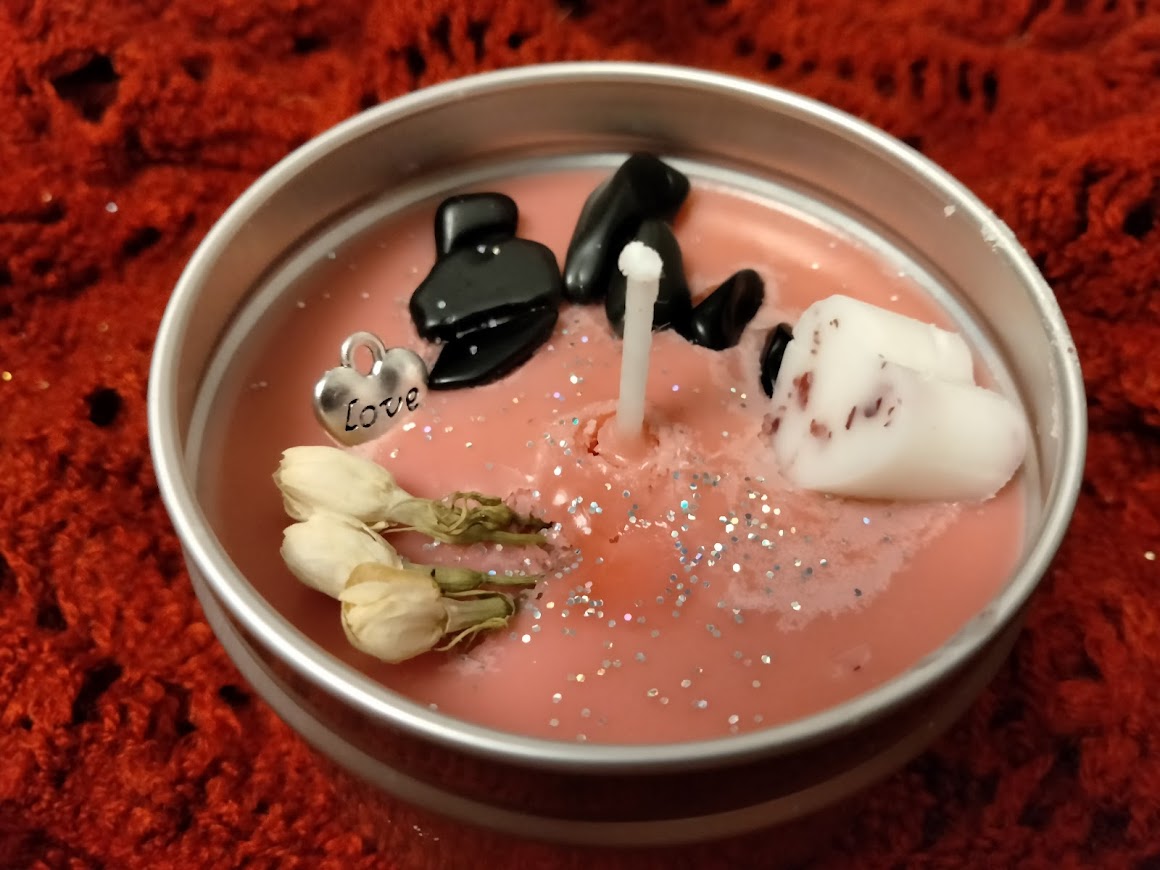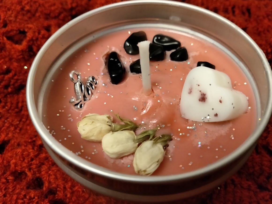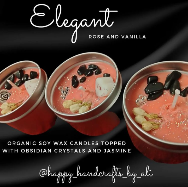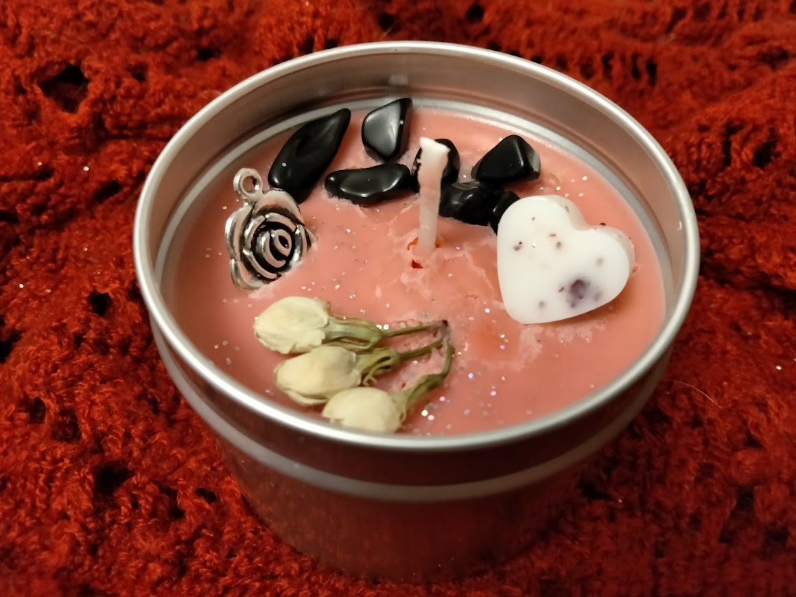 Hand poured organic soy wax candles scented with rose and vanilla essential oils. Each candle is topped with a heart shaped wax melt, jasmine flowers, obsidian crystals, a charm, and biodegradable glitter (made from plants).