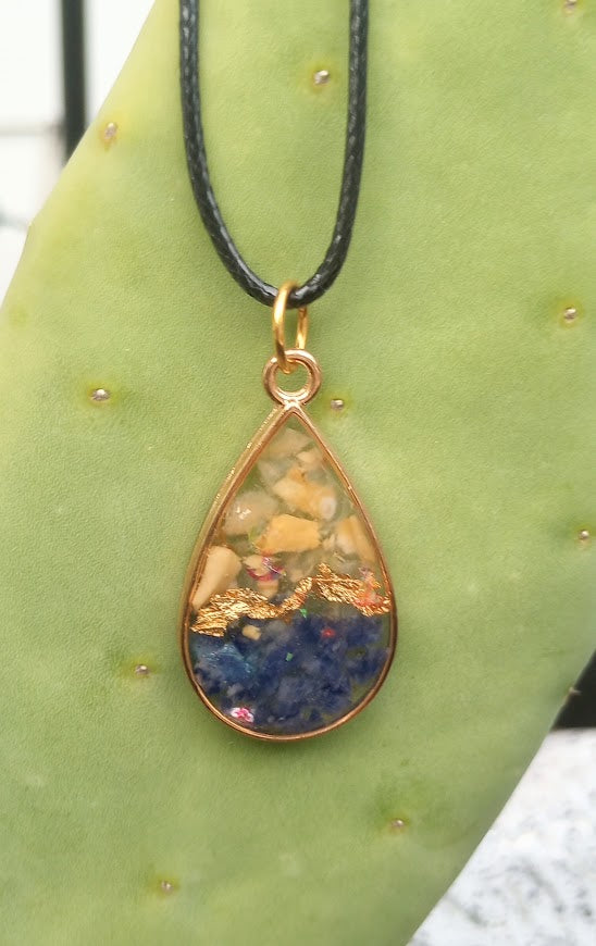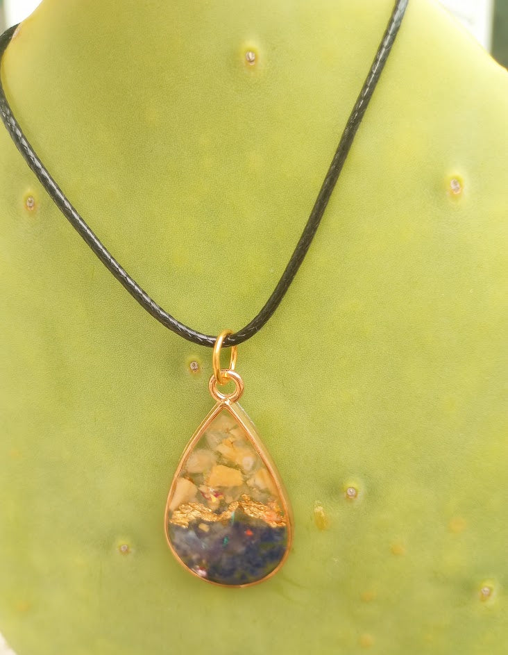 Yellow Aventurine and Sodalite crystals with gold flakes encased in resin and framed with tear drop shaped high quality alloy metal frame. No rust. No color fading. No skin irritation. Hypoallergenic.