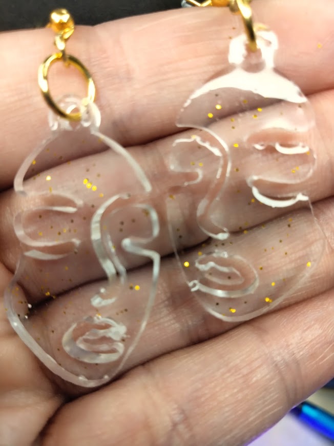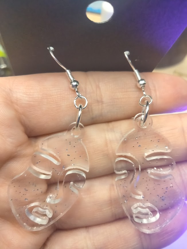 Handcrafted UV resin face earrings with silver or gold glitter accents.