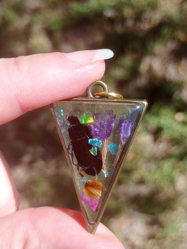Beetle and Forget-me-not flower encased in resin and framed with triangle shaped high quality alloy metal frame. No rust. No color fading. No skin irritation. Hypoallergenic.