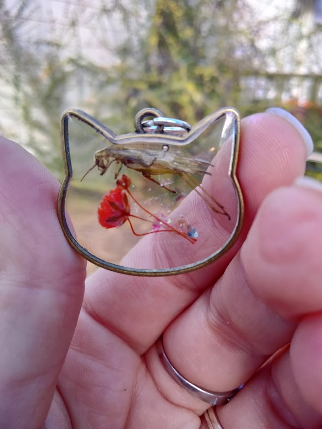 Grasshopper and flower encased in resin and framed with cat shaped high quality alloy metal frame. No rust. No color fading. No skin irritation. Hypoallergenic.