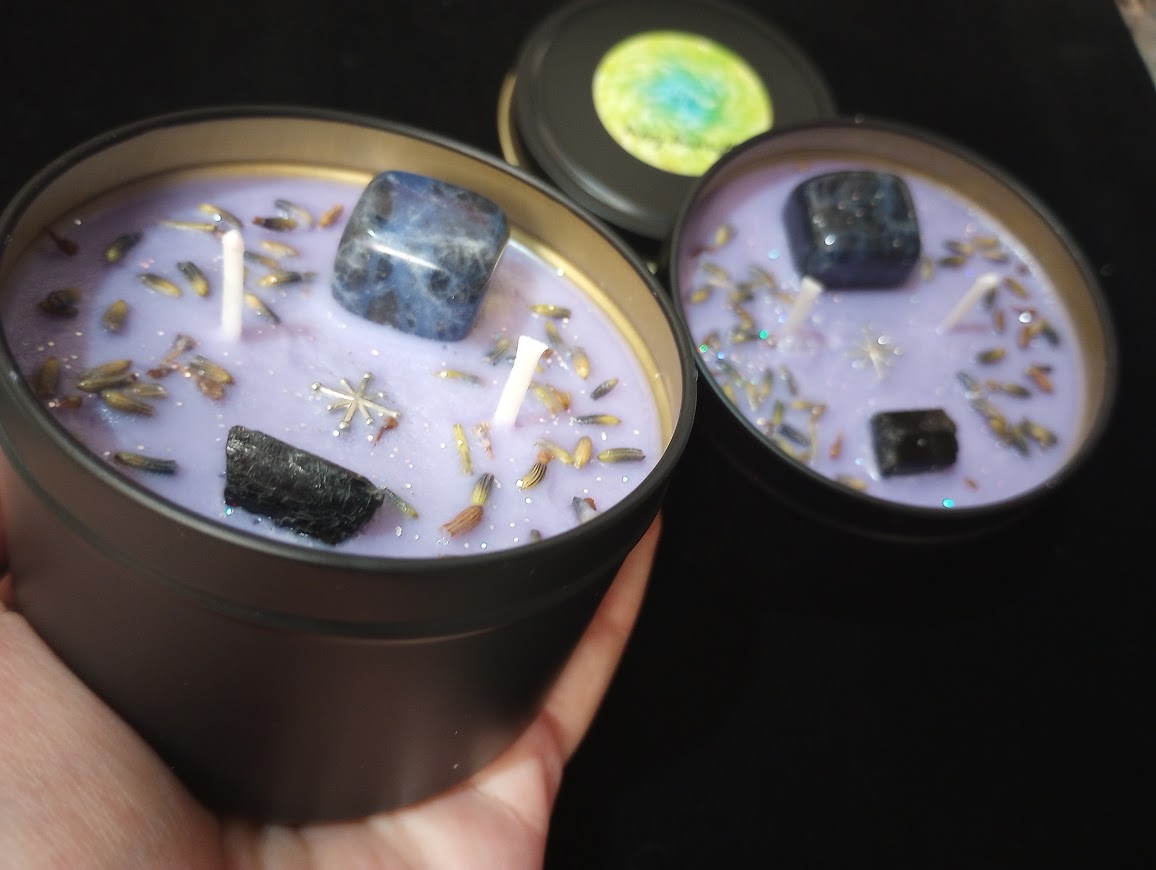 Hand poured organic soy wax candle fragranced with lavender and vanilla essential oils. Topped with Apatite and Tourmaline crystals, lavender buds, and biodegradable glitter.