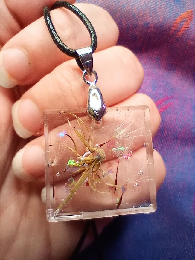 Dandelion stem and fluff encased in resin.