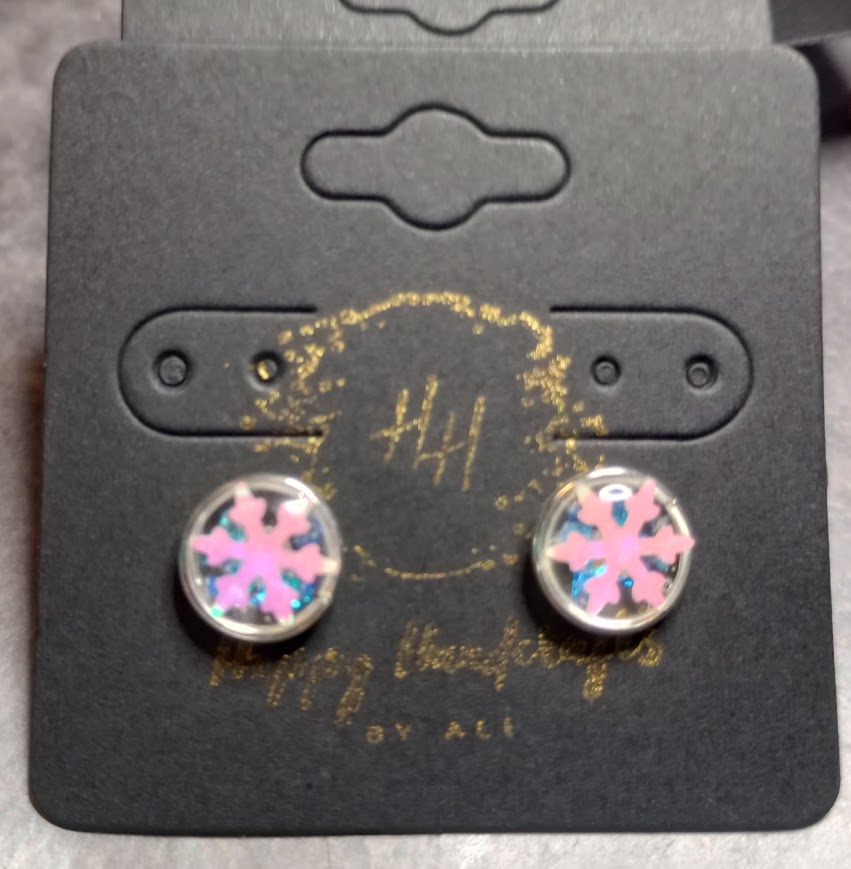 UV resin pink iridescent snowflake stud earrings. 10mm circle.