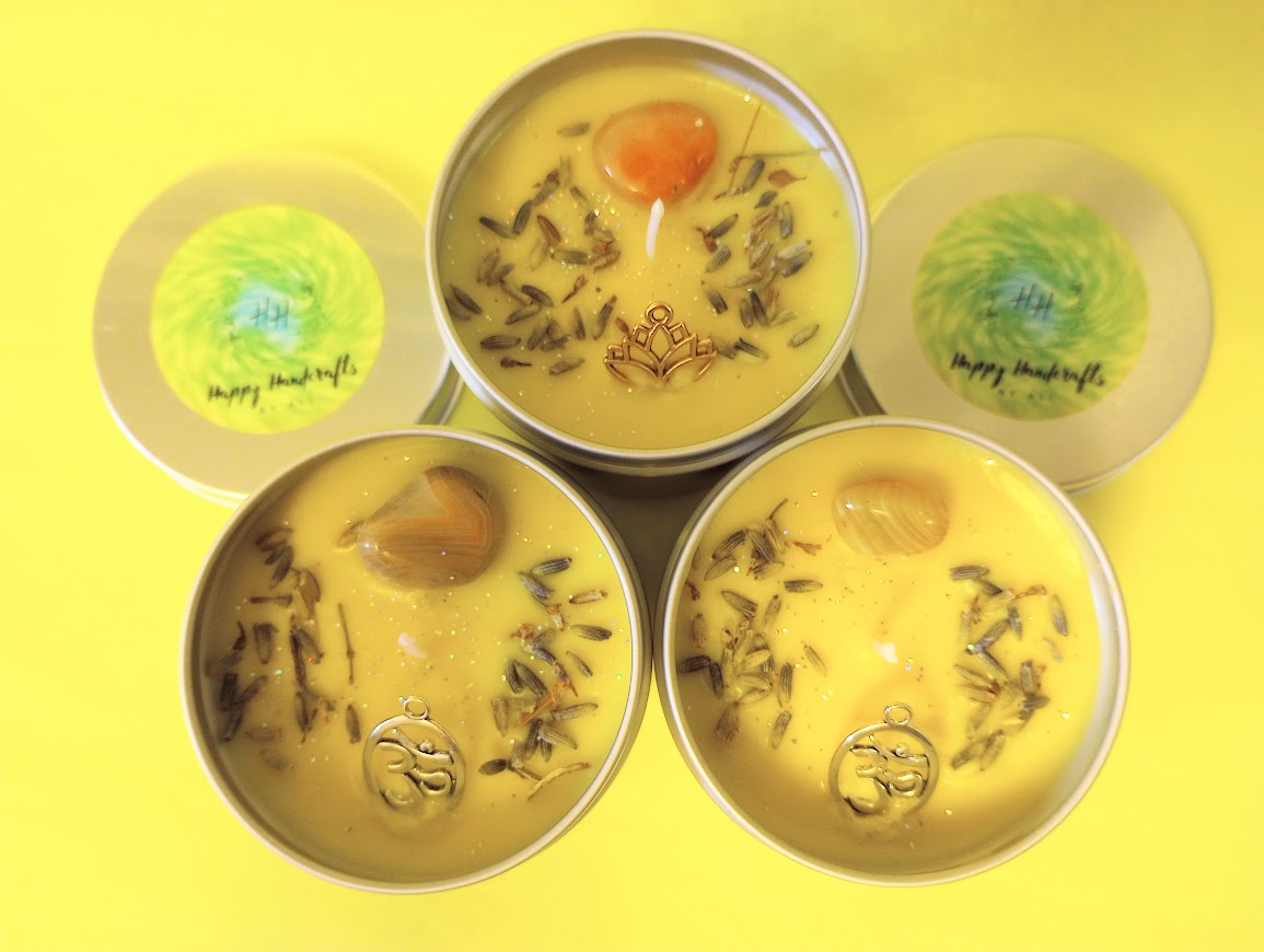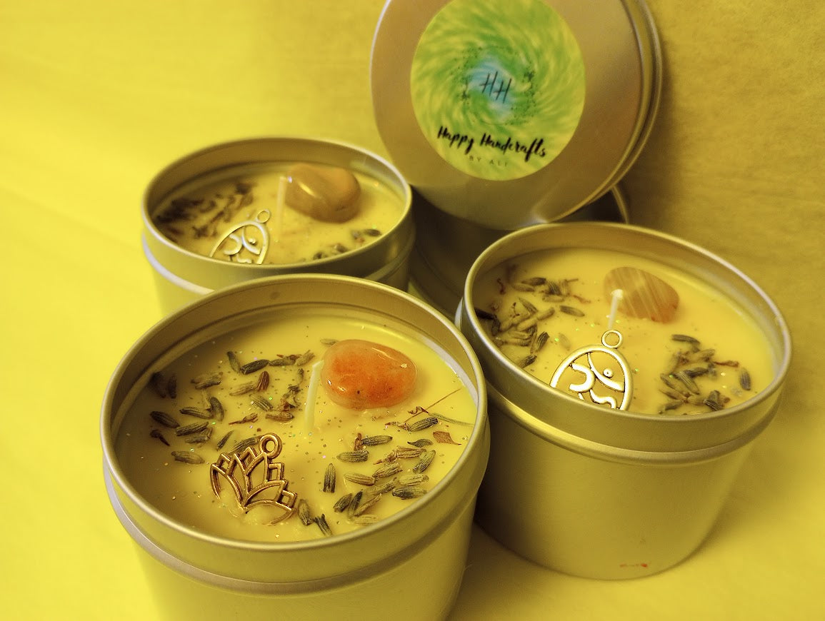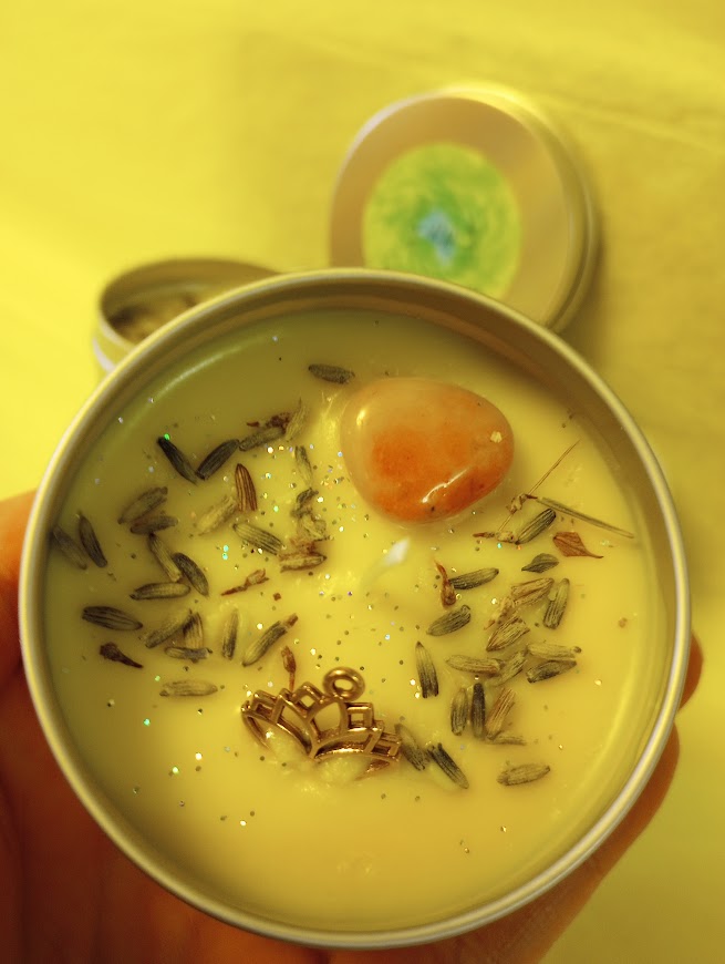 Hand poured organic soy wax candle fragranced with sandalwood and lemon essential oils. Topped with Carnelian or Red Jasper crystal, lavender buds, a charm, and biodegradable glitter.