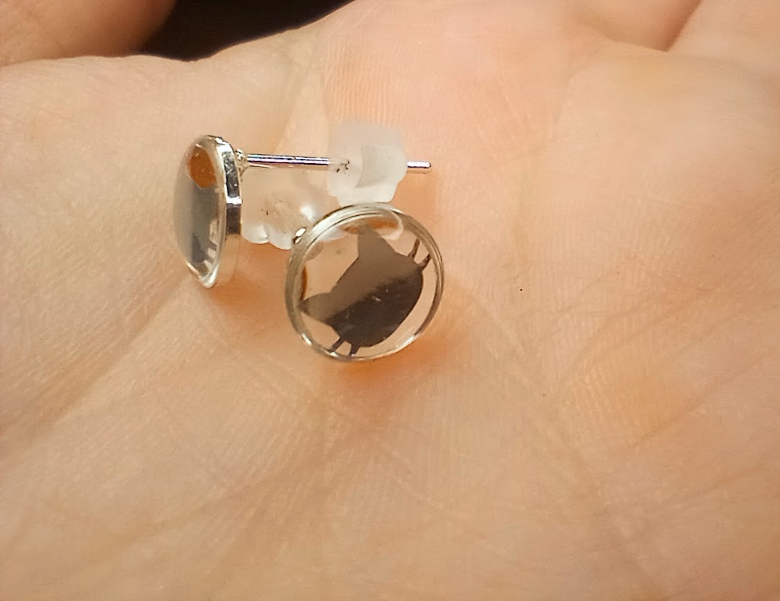 UV resin silver cat stud earrings. 8mm circle.