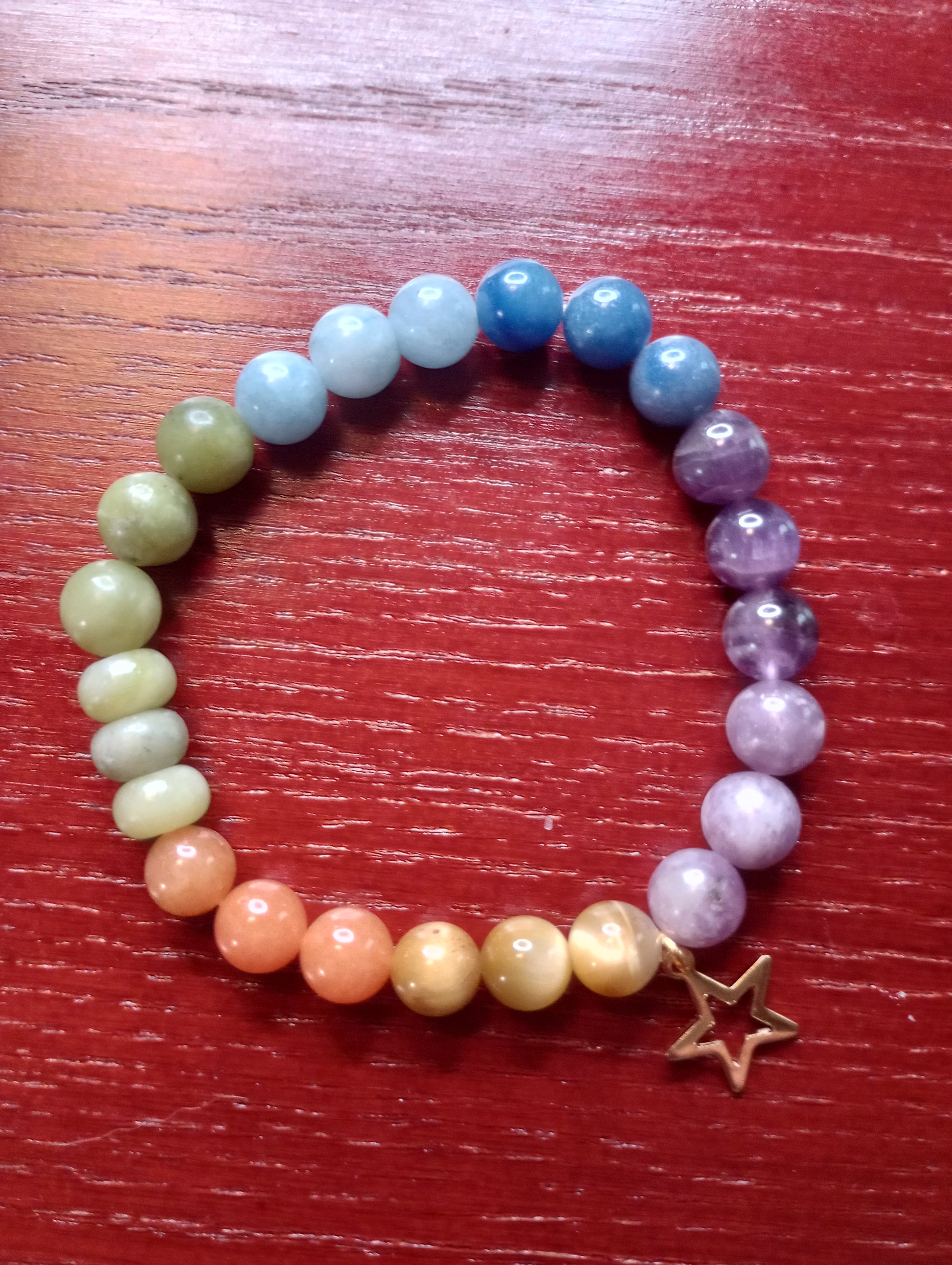 Star Shine healing crystal bracelet is made with crystal beads from Tejas Beads. Authentic healing crystals include Blonde Tiger's Eye, Red Orange Aventurine, Olivine Jade, Aquamarine, Blue Aventurine, Amethyst, and Lepidolite.