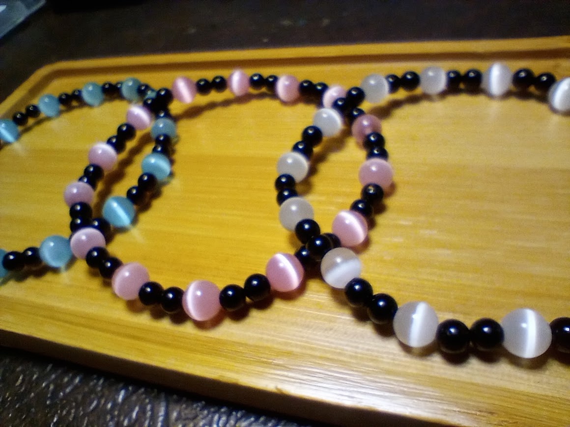 Three obsidian bracelets made with 4mm and 6mm beads. Black beads are obsidian crystals. Color beads are glass.