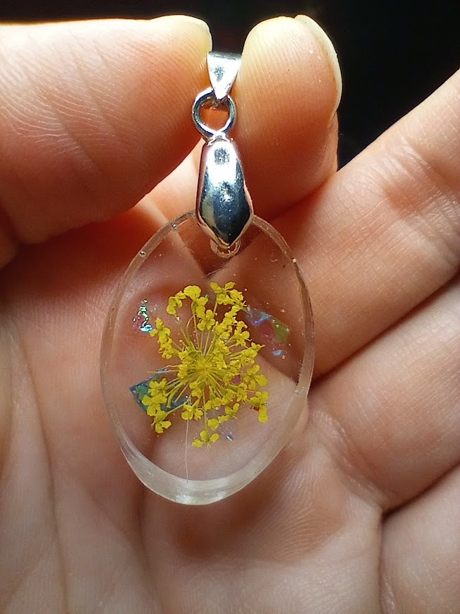 Yellow flower encased in resin. Comes on a black corded chain.