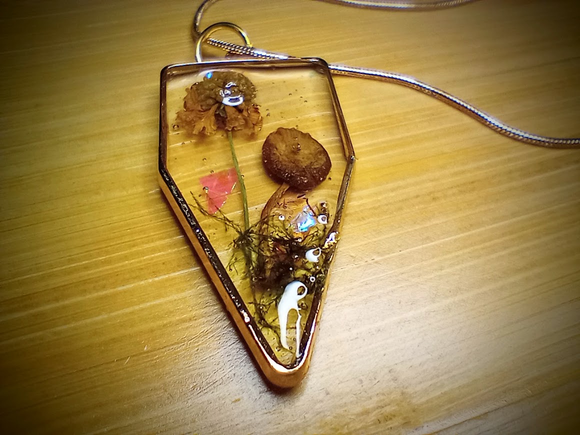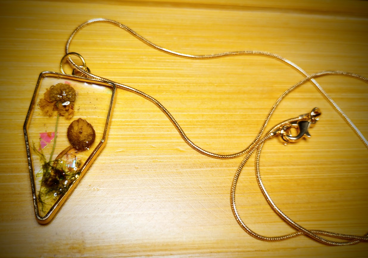 Yellow wildflower with mushroom and tree moss encased in resin and framed with a high quality alloy metal frame. No rust. No color fading. No skin irritation. Hypoallergenic. Comes on a 20 inch 18k gold plated snake chain.
